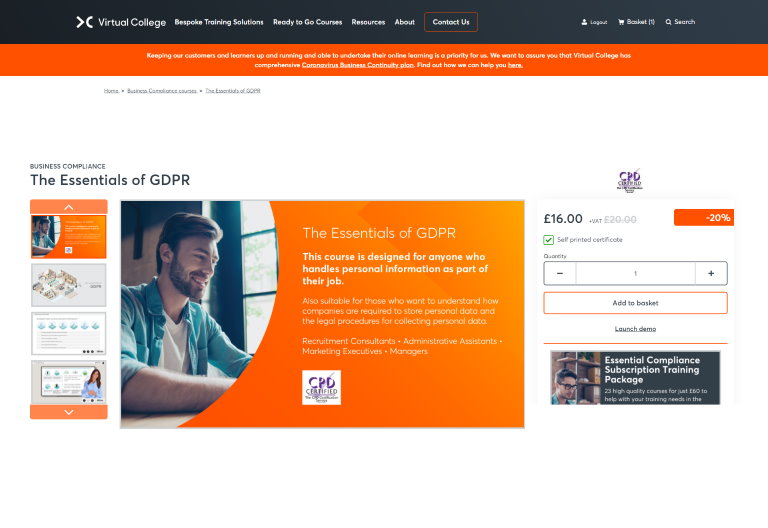 Customers can browse courses on the website and add courses to the shopping basket. On completion of payment, they are then set up on Virtual College's Learning Management System. Extensive integration work has been completed with several external applications throughout the Virtual College build, including their LMS and CRM, Campaign Monitor and Trust Pilot.